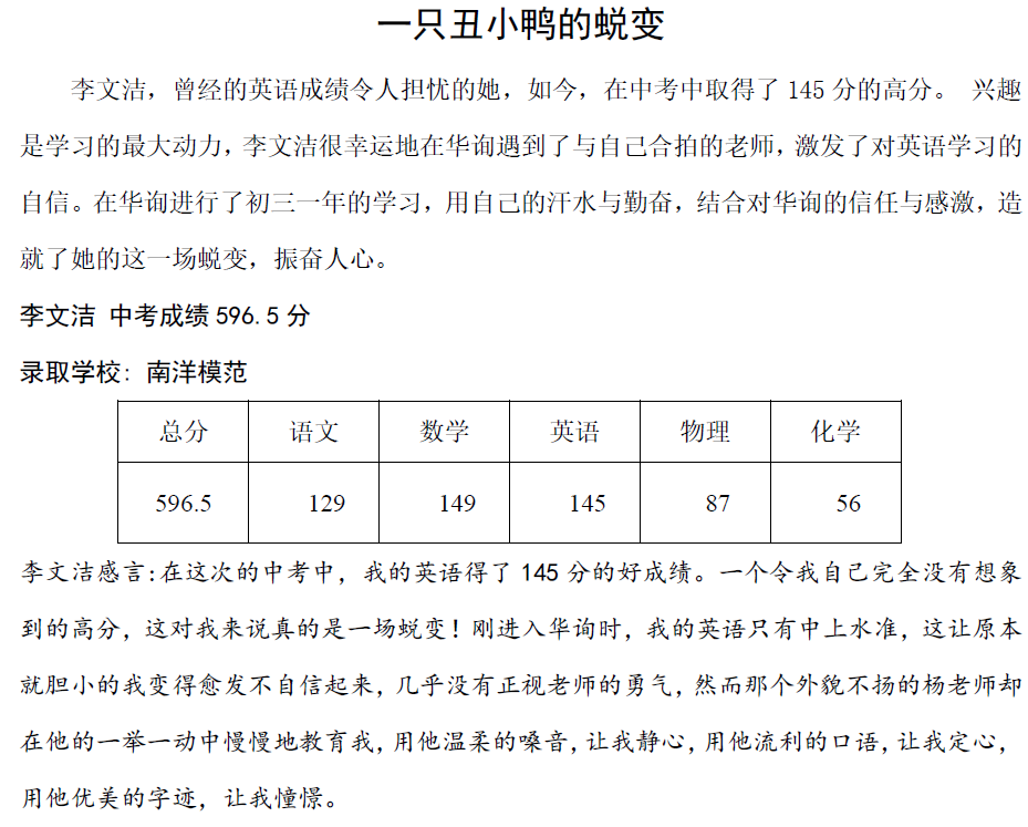 李文潔中考成績596.5分錄取學(xué)校: 南洋模范